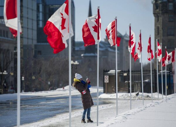 A woman takes photographs on Parliament Hill among flags marking the 50th anniversary of the Canadian Flag in Ottawa on Sunday, Feb. 15, 2015.Justin Tang/The Canadian Press