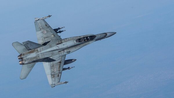A CF-18 Hornet escorts a CC-150 Polaris after being refueled during Operation IMPACT on February 4, 2015. Photo: Canadian Forces Combat Camera, DNDCombat Camera