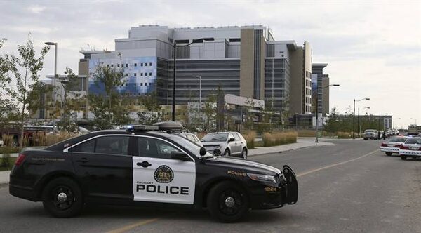 Calgary Police block the entrance to the South Calgary Health Campus as they search for cougars on Thursday, Sept 18, 2014 in Calgary. Police and wildlife officers are watching two cougars that have wandered into south Calgary. One of the cats is near a hospital and the other is at a nearby construction site. THE CANADIAN PRESS/Mike RidewoodThe Canadian Press