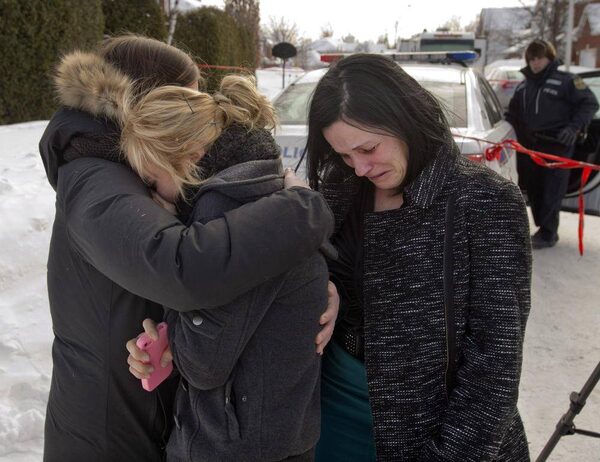 Friends of three people who were found dead in a home comfort each other Tuesday, February 11, 2014 in Trois Rivieres, Que.Ryan Remiorz/The Canadian Press
