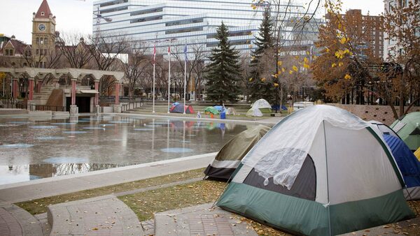 On Tuesday morning in Calgary, bylaw officers, with the support of police, handed out warning tickets to protesters requiring them to remove their tents and signs from Olympic Plaza in the city's downtown within 24 hours.