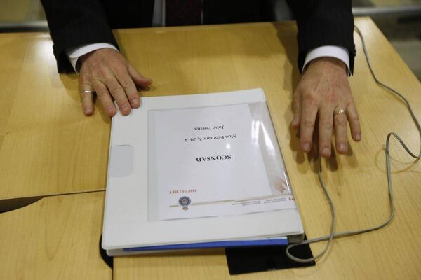 Communications Security Establishment Canada (CSEC) chief John Forster holds a document marked top secret while waiting to testify before the Senate national security and defence committee in Ottawa February 3, 2014. Allied intelligence agencies have general agreements not to spy on each other, but the review body for CSEC has reminded Parliament that exceptions exist for every rule.Chris Wattie/Reuters