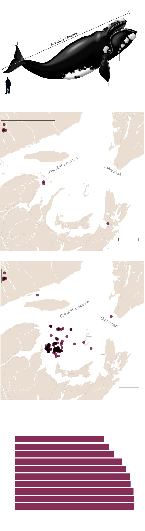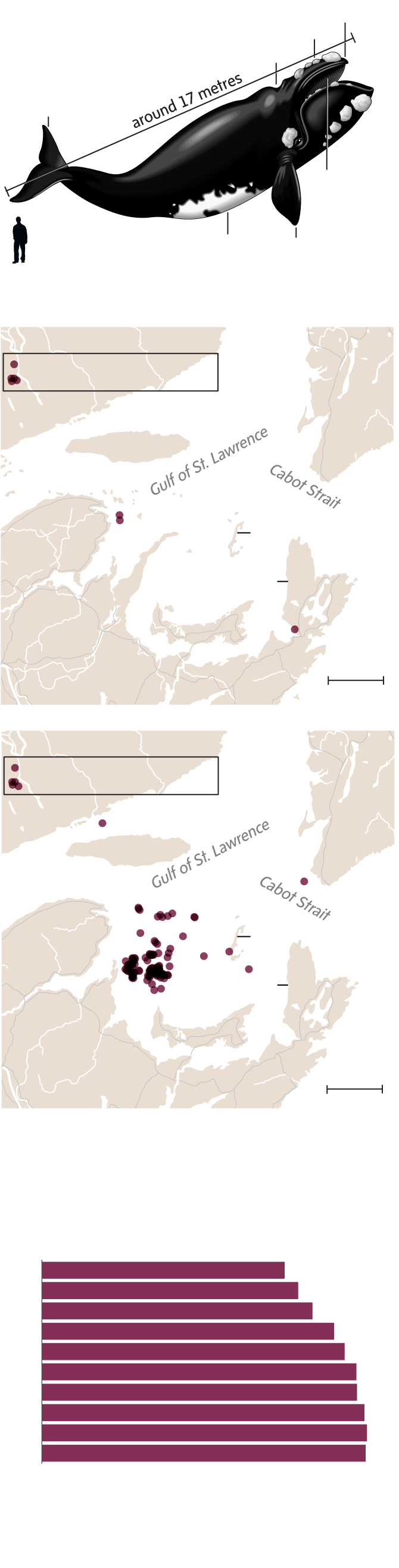 The sightings were initially treated as a passing curiosity. The North Atlantic right whale, a rare and endangered species distinguished by patches of roughened white skin, had been seen off the coast of the Gaspé in Quebec before – though few could recall ever seeing them in this part of the gulf.