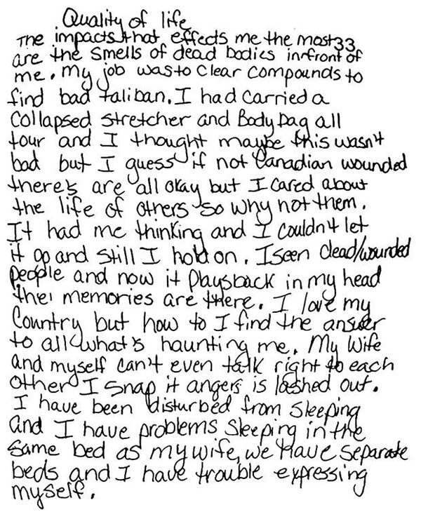About a month later, Veterans Affairs received a handwritten document from Lionel. In it, he described changes to his quality of life after serving in Afghanistan, writing that he loved his country but was haunted by "the smells of dead bodies in front of me," and that he had trouble feeling close to Shanna: "I have problems sleeping in the same bed as my wife."