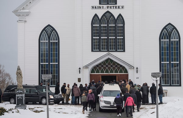 A tattered Canadian flag flies at half-mast for the combined funerals of Lionel Desmond and his mother, Brenda Desmond, at St. Peter’s Church on Jan. 11, 2017. The flag-draped casket carrying Lionel Desmond is removed from the hearse and carried into the church.Darren Calabrese/The Globe and Mail