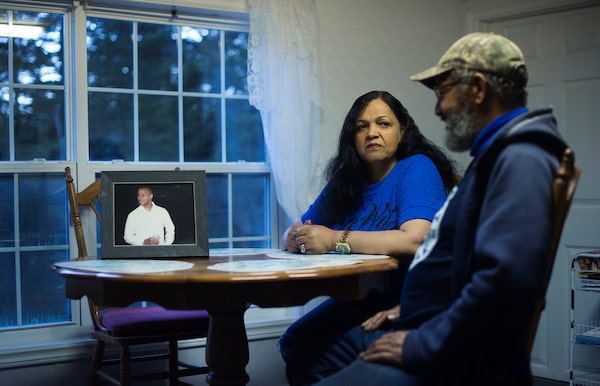 Lionel Desmond’s half-aunt Sandra Greencorn and half-uncle Allan Desmond sit beside a photo of Lionel.Darren Calabrese/The Globe and Mail