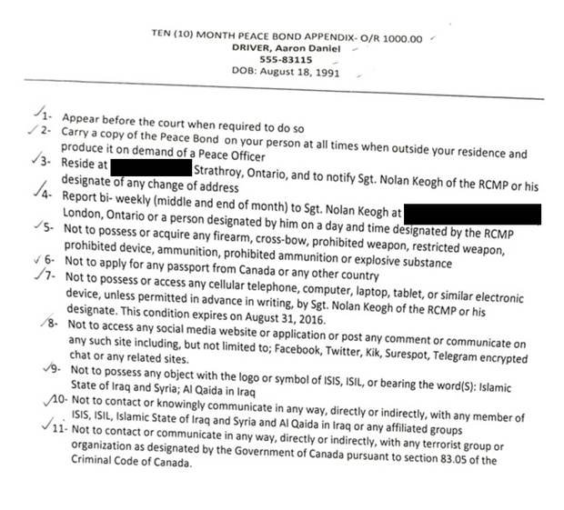 After Mr. Driver's arrest in June, 2015, Mounties applied for a peace bond that could impose limits on his activities, alleging in provincial court documents that investigators believed he might help terrorist groups. When Mr. Driver was released later that month, he was ordered to comply with several conditions. These included wearing a GPS tracking device, not using the Internet or having any communication with Islamic State, including not having any object on his person that bore an Islamic State logo. The restrictions drew criticism from civil liberties activists in Manitoba.