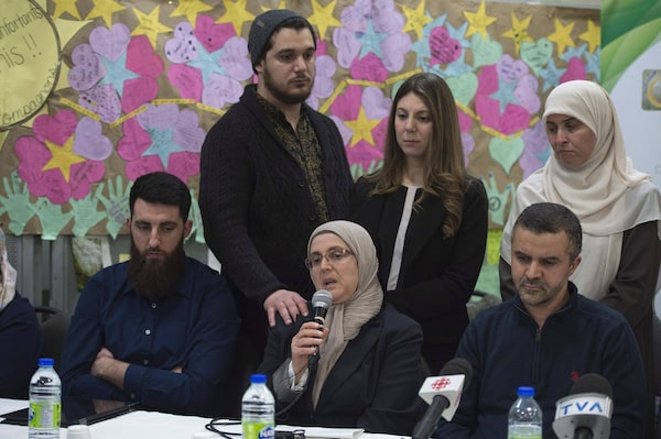 Safia Hamoudi, centre, speaks of the shooting that took her husband, Khaled Belkacemi, one year ago, on Jan. 29, 2017.Jacques Boissinot/The Canadian Press