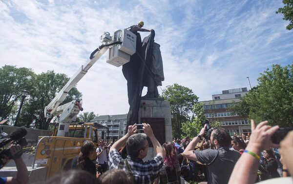 A Halifax City staff member covers the Edward Cornwallis statue with a black tarp as activists protest in Cornwallis Park in Halifax, on July 15, 2017.Darren Calabrese/The Canadian Press