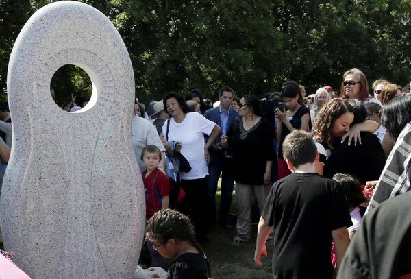 Aboriginal people gather around the monument to missing or murdered women and girls in Winnipeg in August.Lyle Stafford/The Globe and Mail