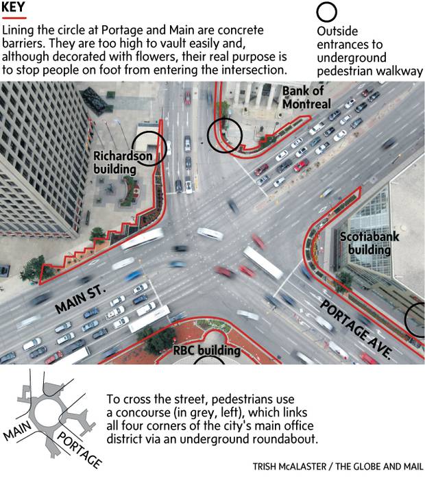 For nearly four decades, people on foot have been banned from crossing at Portage and Main, in an effort to push them through an underground mall. Anyone determined to cross has to jump the concrete barriers and dash through the traffic – a risk few are willing to take.