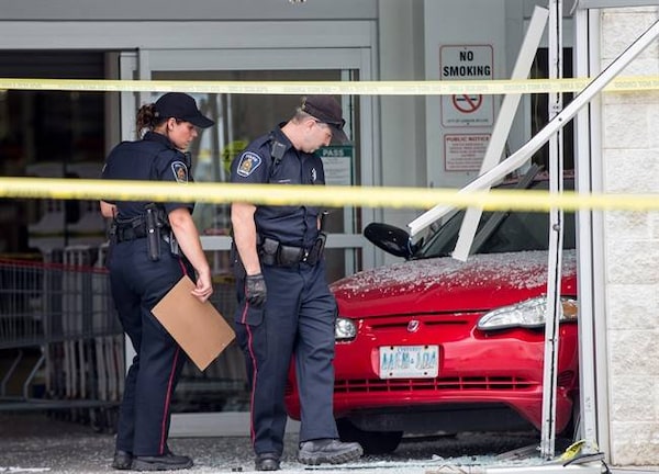 Police investigate after a car backed through the entrance of Costco in London, Ont., on Friday, July 25, 2014. A six-year-old child who was injured after being hit by a car that crashed through the front doors of the store has died. THE CANADIAN PRESS/ Geoff RobinsThe Canadian Press