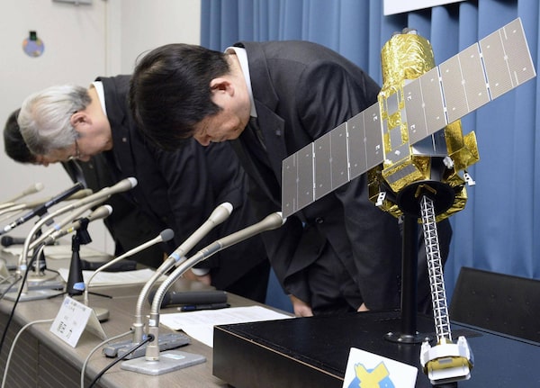 Officials of Japan’s space agency bow beside a model of the Hitomi X-ray telescope on Thursday in Tokyo.Munehide Someya/The Associated Press
