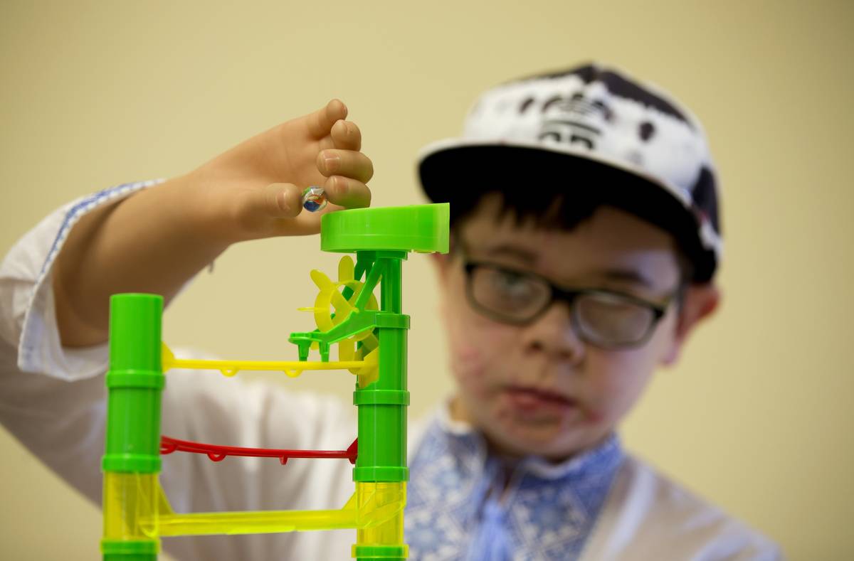 Mykola grips a marble with his prosthetic arm during occupational therapy. (Christinne Muschi for The Globe and Mail)