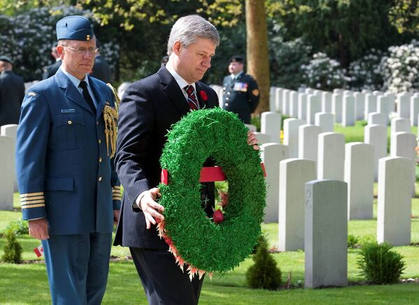 Prime Minister Stephen Harper lays a wreath at the memorial during a ceremony at the military cemetary in Bergen op Zoom Thursday May 6, 2010.Adrian Wyld/The Canadian Press