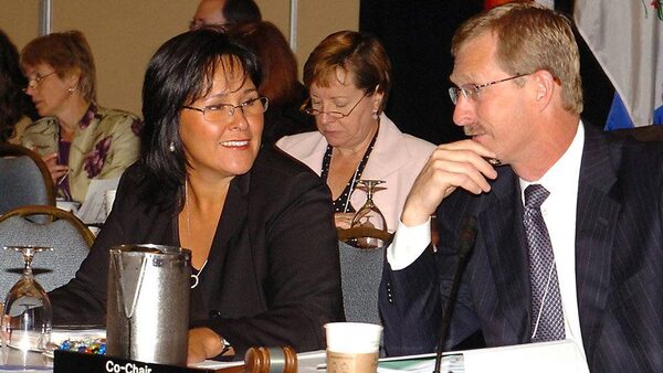 Federal Health Minister Leona Aglukkaq (left) and her Newfoundland and Labrador co-chair, Jerome Kennedy, chat prior to the start of a meeting of federal, provincial and territiorial health ministers Sept. 14, 2010 in St. John's.Gary Hebbard/The Canadian Press