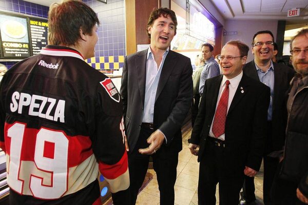 Liberal Party Leader Justin Trudeau, middle, and Liberal MP Kevin Lamoureux, right, joke with an Ottawa Senators supporter at a food court in downtown Winnipeg on May 2, 2013.JOHN WOODS/The Canadian Press