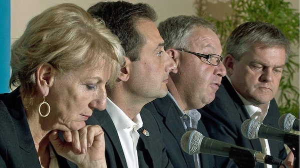 Newfoundland Premier Kathy Dunderdale, PEI Premier Robert Ghiz, Nova Scotia Premier Darrell Dexter and New Brunswick Premier David Alward hold a news conference in Brudenell, PEI, on June 6, 2012.Andrew Vaughan/The Canadian Press