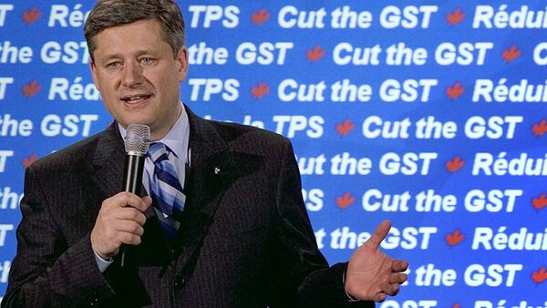Then conservative leader Stephen Harper reaffirms his party's promise to reduce the GST during a rally in January, 2006.Paul Chiasson