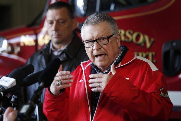 Minister of Public Safety and Emergency Preparedness Ralph Goodale speaks to the media as Greg Janzen, Reeve of Emerson-Franklin, listens in after a visit with officials at the fire hall in Emerson, Manitoba, on March 4, 2017.JOHN WOODS/The Canadian Press
