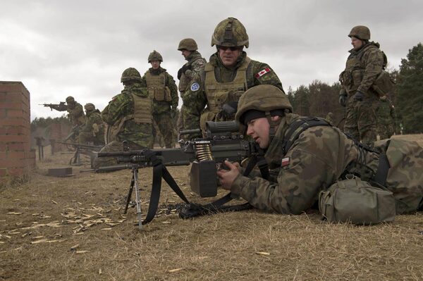 A Canadian Armed Forces member looks on as a Polish soldier fires a C9 machine gun at the Drawsko Pomorskie Training Area in Poland during Operation REASSURANCE on March 15, 2016.Master Corporal Andrew Davis
