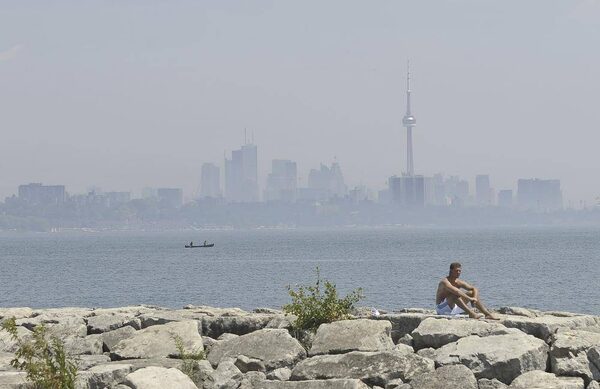 A sunbather sits on the rocks as a thick smoggy haze sits over Toronto as seen from the Humber River area, July 6, 2012. (J.P. Moczulski for The Globe and Mail)J.P. MOCZULSKI/The Globe and Mail