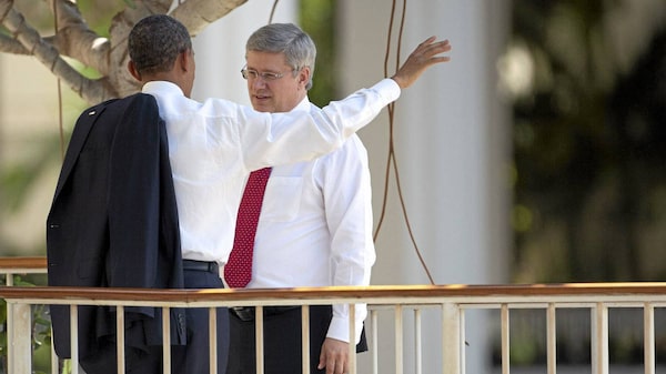 President Barack Obama talks with Canadian Prime Minister Stephen Harper during the Asia-Pacific Economic Cooperation (APEC) summit at the J.W. Marriott Hotel on Nov. 13, 2011 in Honolulu, Hawaii.Pool/Getty Images/The Associated Press