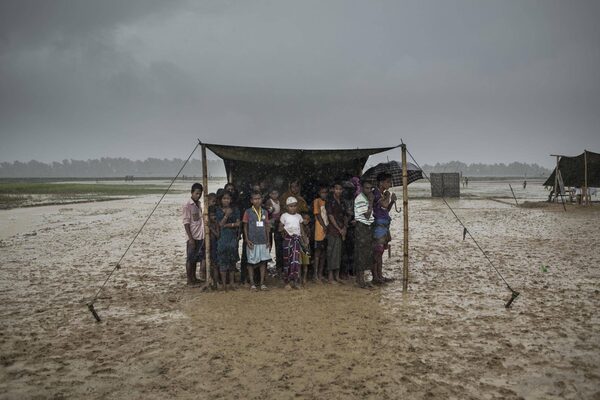 Rohingya refugees take shelter from the rain at the Nayapara refugee camp in Bangladesh’s Ukhia subdistrict on Friday. Rohingya news agencies have reported that border guards used by the Canadian delegation were involved in the burning of villages in Rakhine, where the Rohingya suffer from serious restrictions on their basic rights.FRED DUFOUR/AFP / Getty Images