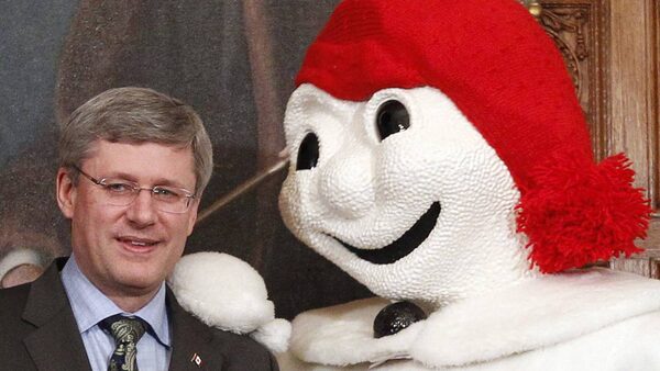 The jovial mascot of the Quebec City winter carnival applied some gentle pressure during a photo op with Stephen Harper in his wood-panelled Parliament Hill office.