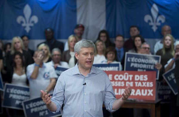 Conservative leader Stephen Harper addresses a gathering as he attends a campaign event in Trois-Rivieres, Que., Thursday, Oct. 15, 2015. Canadians will go to the polls in the Federal election Oct. 19.JONATHAN HAYWARD/The Canadian Press