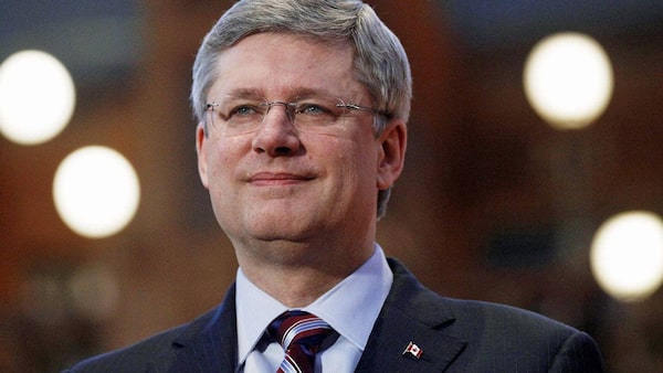 Prime Minister Stephen Harper grins during a photo-op at the Library of Parliament on Feb. 28, 2011.CHRIS WATTIE/Reuters