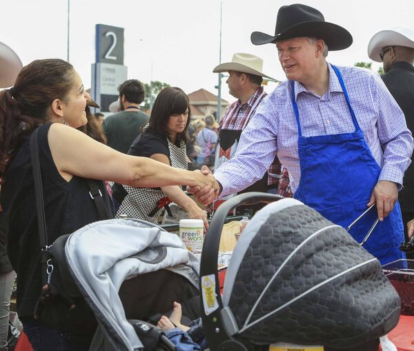 Prime Minister Stephen Harper shakes hands with a woman while serving pancakes during the Calgary Stampede in Calgary, Alberta, in this file photo taken July 4, 2015. Speculation mounted on Thursday that Canada's election campaign would formally begin on Sunday, with the governing Conservatives planning a Montreal rally with Prime Minister Stephen Harper on Sunday evening.STRINGER/Reuters