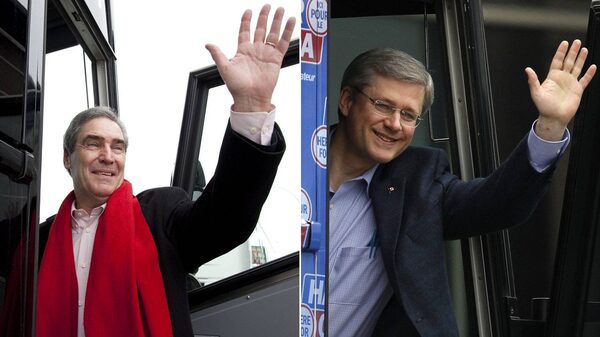 In this combination photo, Liberal leader Michael Ignatieff (L) waves as he gets on his bus following a campaign stop in Regina, Sask, Saturday, April 16, 2011. Conservative leader and Canada's Prime Minister Stephen Harper (R) waves as he boards his campaign bus in Richmond Hill, Ontario April 7, 2011.Jonathan Hayward/The Canadian Press and Chris Wattie/Reuters