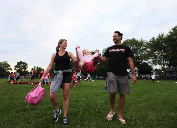 Audrey Lafond, right, and her spouse, Cedrick Billequey, play with their 2-year-old daughter, Juliette, at a soccer game in Laval-des-Rapides, Que., Aug. 21, 2012.Christinne Muschi/The Globe and Mail
