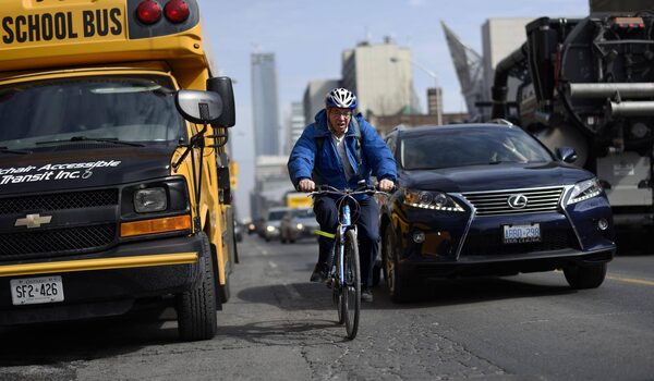 A cyclist heading westbound on Toronto’s Bloor St. West manoeuvres between parked vehicles on the left and live traffic on the right on March 8, 2016.Fred Lum/The Globe and Mail