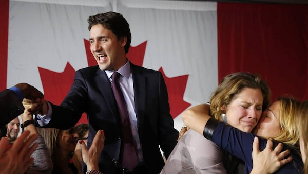Liberal Party leader Justin Trudeau waves while accompanied by his wife Sophie Gregoire (2nd from R) as he arrives to give his victory speech after Canada's federal election in Montreal, Quebec, October 19, 2015.Jim Young/Reuters