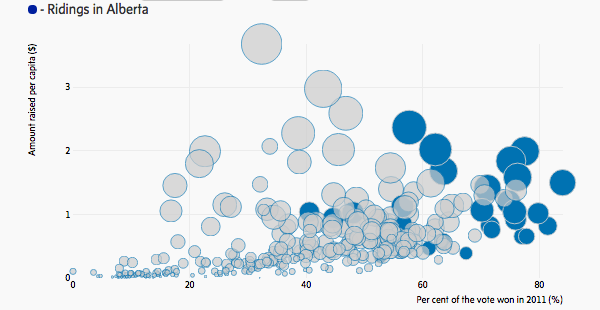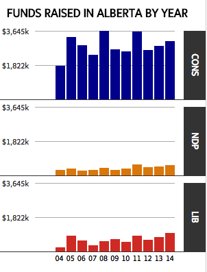 The NDP has been less successful in the province. Even as the provincial New Democrats managed to topple more than 40 years of provincial Progressive Conservative rule in Alberta this year, there is scant evidence that the federal NDP is seeing a surge of financial support in the province. Last year, Mr. Mulcair’s party raised just $582,000 in Alberta.