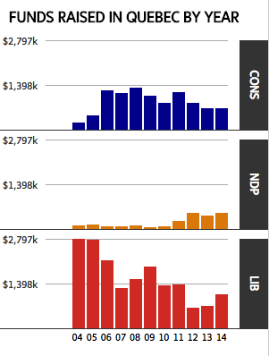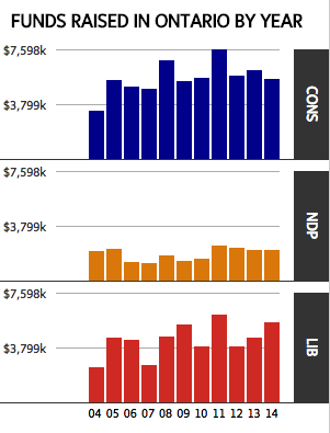 In 2014, the Conservatives and the Liberals each raised close to $8-million each from Ontario, more than three times what those parties raised in 2004. Only the NDP has seen very little change in Ontario over the past decade: In 2014 the party raised roughly $2.5-million in the province, just $400,000 more than it did in 2004.
