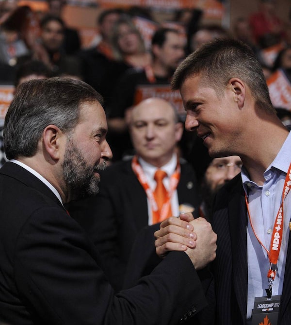 Adam Giambrone and federal NDP Leader Thomas Mulcair shake hands at the party’s leadership convention in Toronto March 24, 2012.Fred Lum/The Globe and Mail
