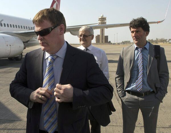 Canadian Foreign Affairs Minister John Baird (left), Liberal MP Marc Garneau, (centre) and NDP MP Paul Dewar, right, arrive at the airport, Wednesday, September 3, 2014 in Baghdad, IraqRyan Remiorz/The Canadian Press