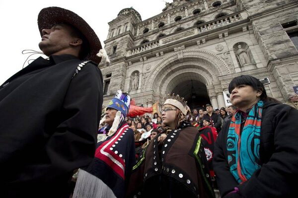 Protesters take part in a mass sit-in in front of the British Columbia legislature in Victoria, B.C. Monday, Oct. 22, 2012. to protest the proposed Northern Gateway pipeline. Native leaders say the report could perhaps set the stage for groundbreaking talks between First Nations and government over several multibillion-dollar energy developments that have been proposed in B.C.JONATHAN HAYWARD/The Canadian Press