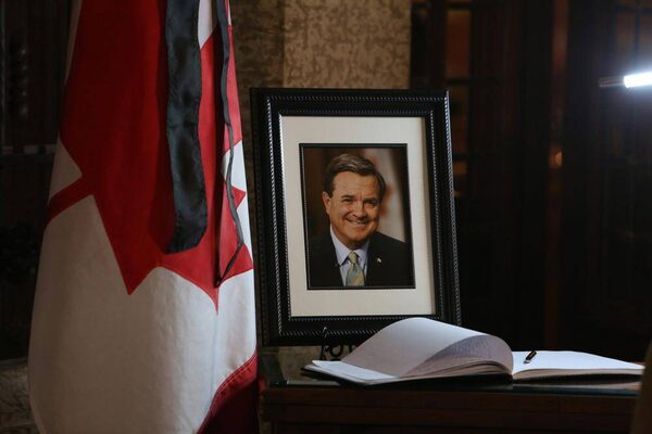 A book of condolences and a photograph of former Finance Minister Jim Flaherty is placed on a table in the lobby of House of Commons on April 11, 2014.FRED CHARTRAND/The Canadian Press