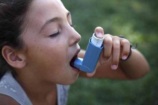 A child uses a puffer to control asthma symptoms.