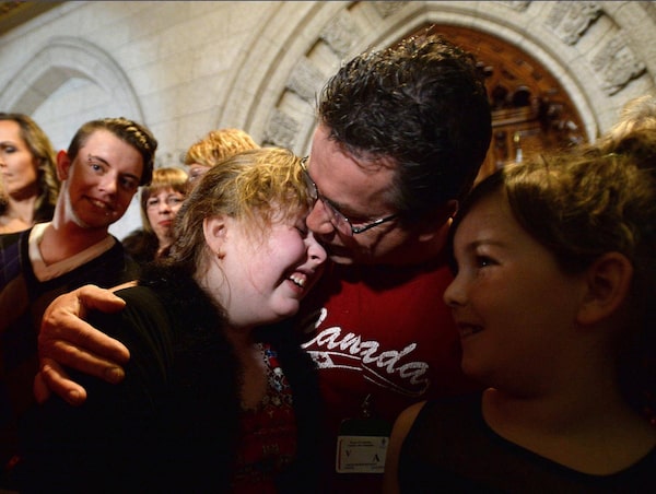 Charlie Lowthian-Rickert, 10, a transgender child, is comforted by her father, Chris Rickert, and friends after speaking alongside Justice Minister Jody Wilson-Raybould during an announcement in the House of Commons Tuesday regarding legislation on gender identity and gender expression.Sean Kilpatrick/The Canadian Press
