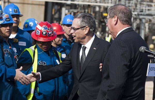 Minister of Natural Resources Joe Oliver, middle, and LyondellBasell Senior Vice President Kevin Brown, right, greet refinery workers before a press conference on Wednesday March 6, 2013 at the LyondellBasell Refinery in Houston.Patric Schneider/The Associated Press