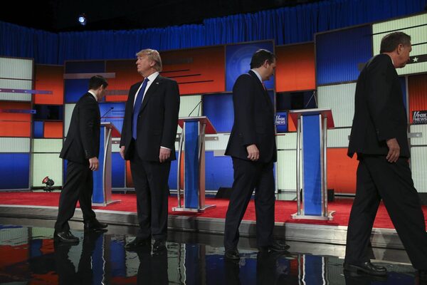 Donald Trump waits a moment as, from left: Sen. Marco Rubio, Sen. Ted Cruz and Gov. John Kasich take their places for a Republican presidential debate hosted by Fox News at the Fox Theater in Detroit, March 3, 2016.RICHARD PERRY/The New York Times
