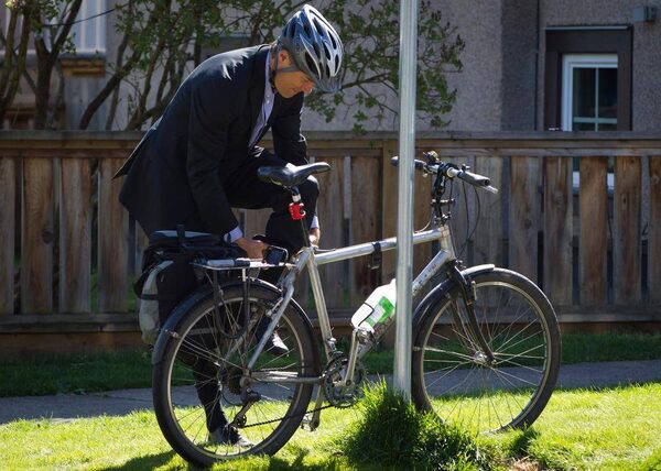 Vancouver Mayor Gregor Robertson prepares to ride his bike back to City Hall after announcing changes to the food scrap recycling program in Vancouver, B.C., on Thursday April 11, 2013.