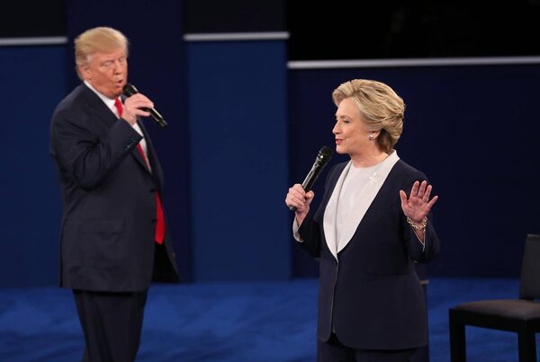 Hillary Clinton, 2016 Democratic presidential nominee, and Donald Trump, 2016 Republican presidential nominee, speak during the second U.S. presidential debate at Washington University in St. Louis, Missouri, U.S., on Sunday, Oct. 9, 2016.Daniel Acker/Bloomberg