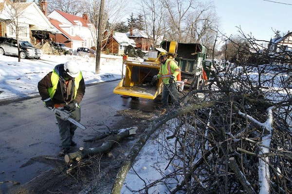 Contractors working on behalf of the City of Toronto clean up branches left by the ice storm in North York on Friday.Fernando Morales/The Globe and Mail