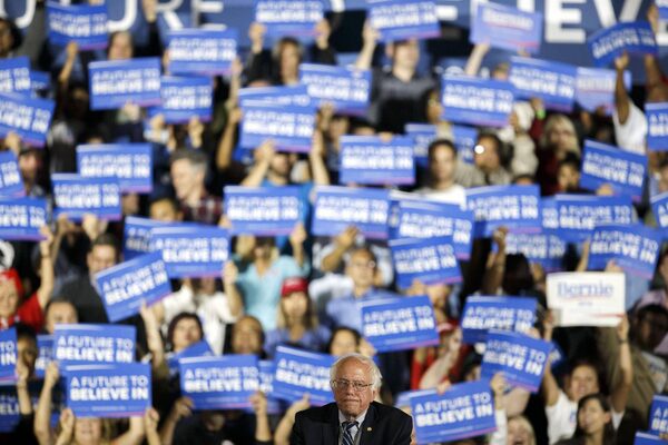 Senator Bernie Sanders pauses during an election night rally at Barker Hanger in Santa Monica, Calif., on Tuesday, June 7, 2016.Patrick T. Fallon/Bloomberg